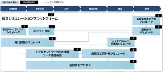 今後、船舶需要の中心は温室効果ガス排出削減のための代替燃料利用、風力推進ほかの省エネ技術、自動運航をはじめとする高度な統合制御システムを採用した高性能次世代船舶へと移行します。日本の海事産業は、労働人口が減少する一方で世界的な需要拡大に伴う建造能力拡大も求められており、機能・仕様が高度化・複雑化する高性能次世代船舶を短期間に開発・供給する能力を獲得する必要があります。このための方策として、本研究開発課題では初期の開発、設計段階で、建造、運用のライフサイクルとサプライチェーンを同時並行的に考慮して、本船仕様、建造計画を最適化する「統合シミュレーション・プラットフォーム」を構築し、バーチャル・エンジニアリングの手法の海事産業への導入を推進します。また、船舶の安全な運用に影響を与える気象・海象の予測についても、台風などの極端現象を含む1~3カ月先までの季節予測技術を確立し、統合シミュレーション・プラットフォームに組み込みます。