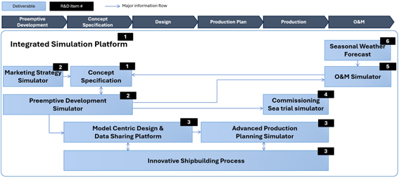Based on the components of the Integrated Simulation Platform, research and development will be promoted across six R&D items. In 2028, an interim evaluation including a stage-gate assessments will be conducted, and by 2030, the deliverables from each R&D topic will be integrated into the Integrated Simulation Platform (see diagram below), aiming for its demonstration in the design and construction of actual ships.